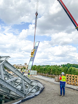За десять дней необходимо было установить 14 очень высоких изогнутых стекол. Размер вогнутых стеклянных элементов составлял 1,4 метра (4,6 фута) в ширину и 7,5 метра (24,6 фута) в высоту. Для транспортировки стеклянных элементов на круглый внутренний двор использовался строительный кран, а оттуда мини-кран Heavydrive выполнял их установку под массивную стальную конструкцию на фасад в форме огромного стеклянного диска.