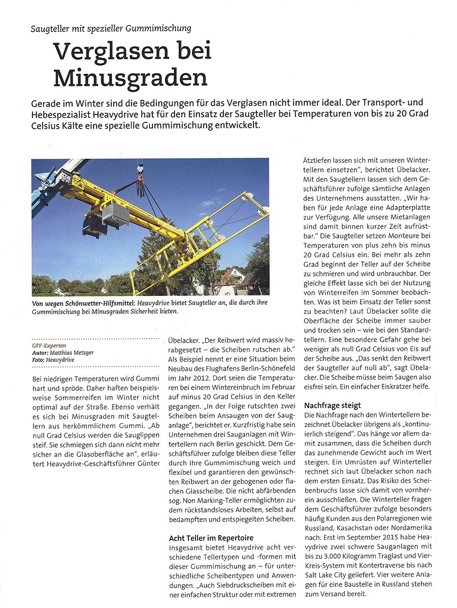GFF, практический журнал по производству и монтажу, в своем выпуске 3/2016 рассказывает о наших присосках для остекления при минусовых температурах.