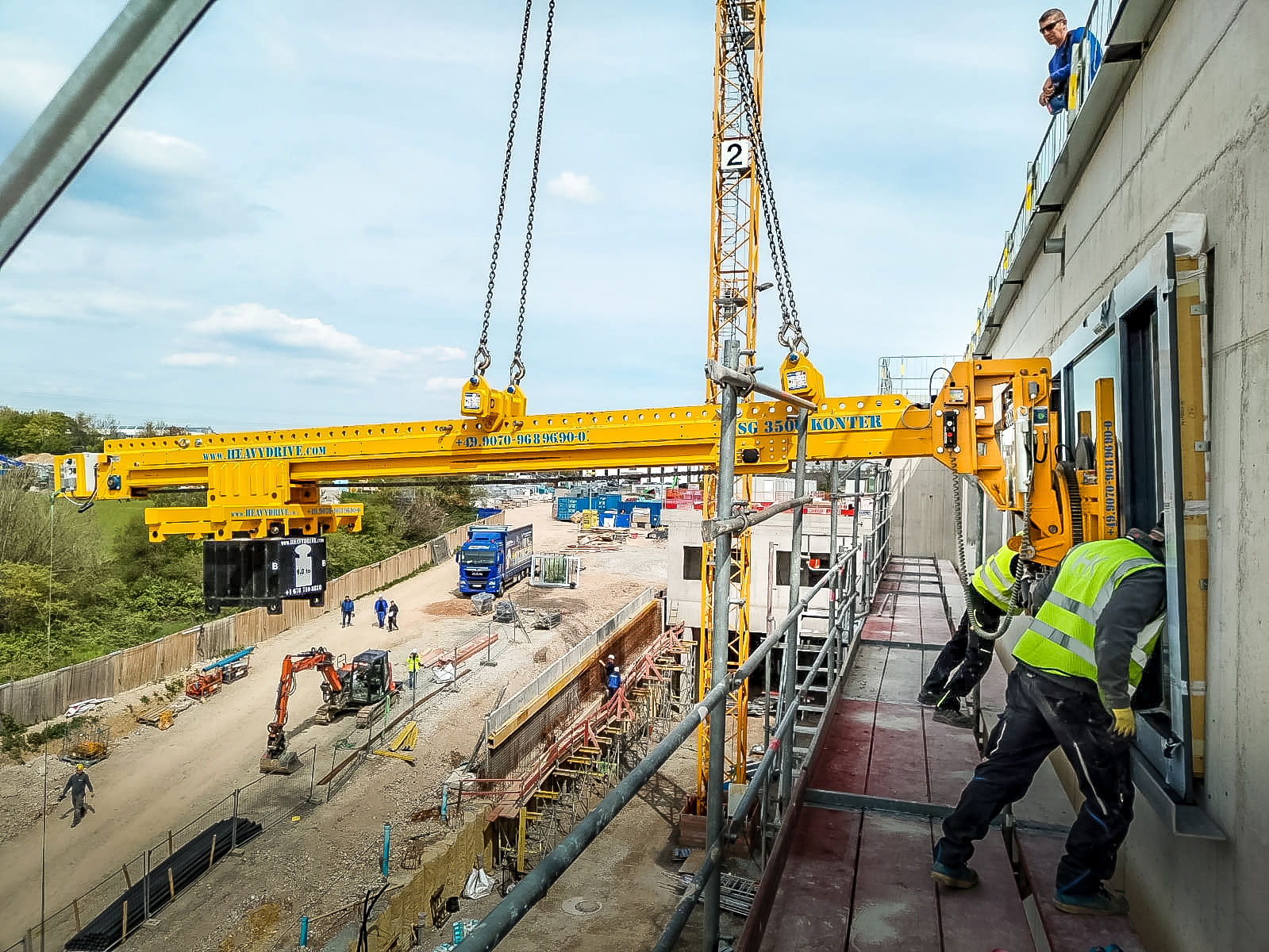 На новом здании вычислительного центра во Франкфурте-на-Майне (Германия) необходимо было установить бронированные оконные элементы на трех этажах. Отдельные готовые фасадные элементы, состоящие из стеклянных полотен в стальных рамах, размером до 6 х 2,2 м и массой до 2,3 т (5071 фунт) необходимо было установить частично за строительными лесами. Для такого сложного монтажа использовались специальные подъемные установки Heavydrive.