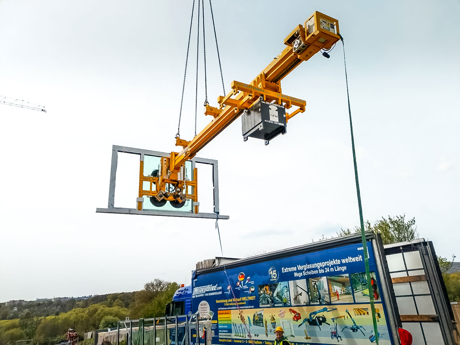 Чтобы безопасно выполнить эти монтажные работы, требующие большого мастерства, компания Heavydrive провела несколько эксплуатационных испытаний на площадке заказчика, чтобы определить, как зафиксировать стекло вакуумными захватами со стороны тонкого слоя и не перенести на него всю нагрузку. После этого эксперты компании совместно с заказчиком разработали оптимальное монтажное решение. Для поддержки тяжелой рамы эксперты Heavydrive зафиксировали под этим элементом стальной угол, регулируемый по высоте. Это позволило перенести основную часть нагрузки на раму вакуумной установки. Установка для вакуумной фиксации при этом приобрела еще и защитную функцию: элемент в ней был защищен от падения. Затем тяжелые элементы были перенесены в конечное положение с помощью траверсы с противовесом, расположенной за установкой для вакуумной фиксации, без участия ручного труда.